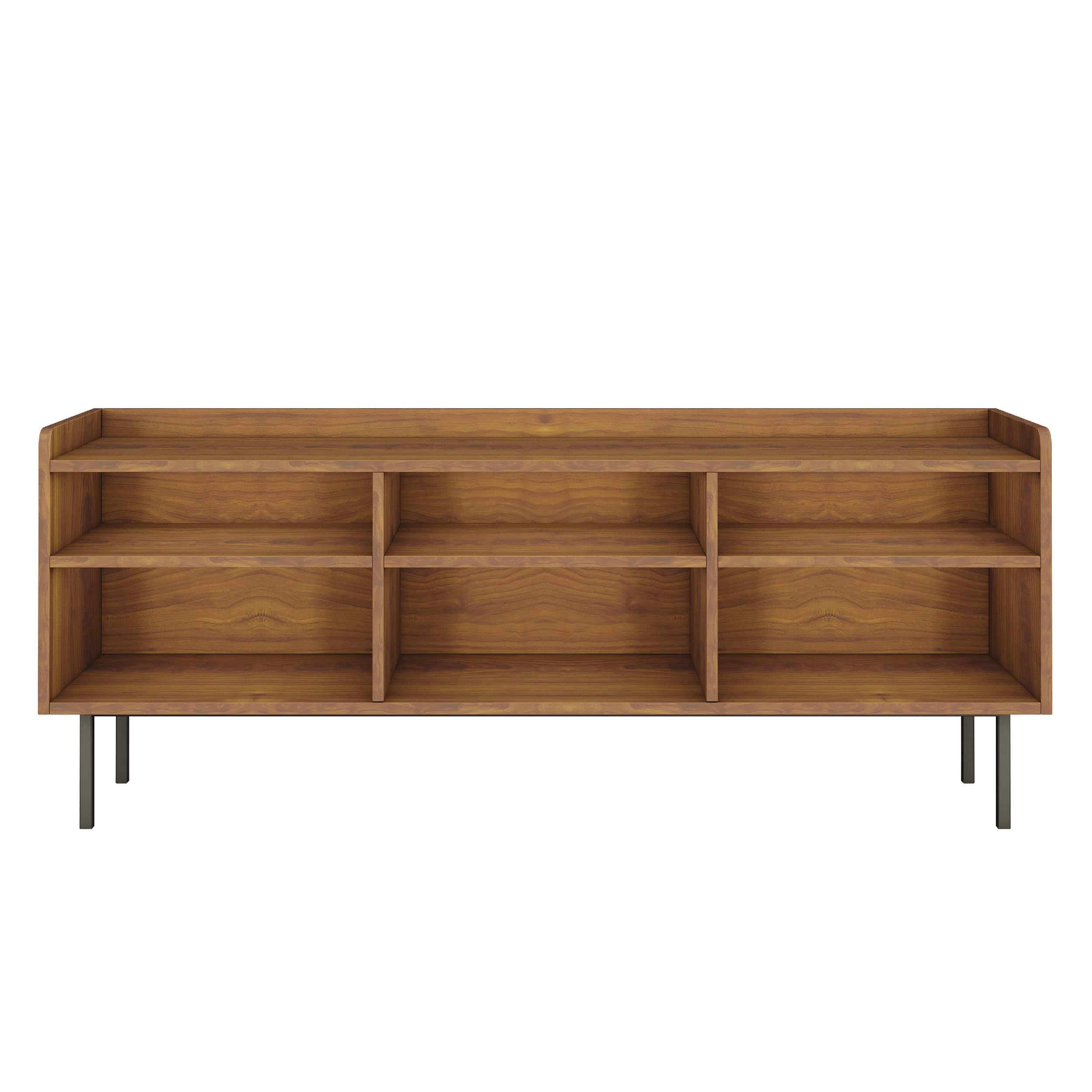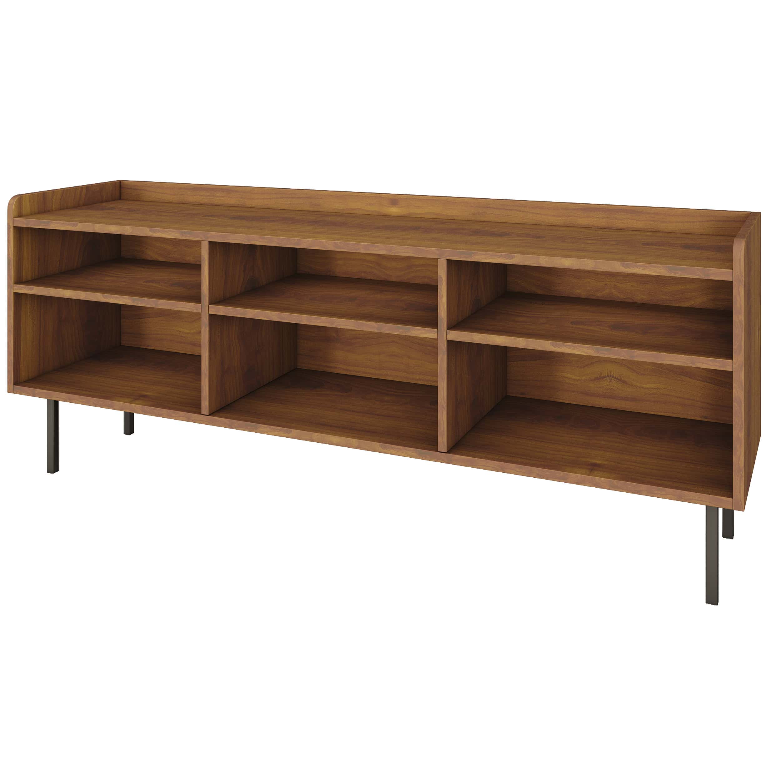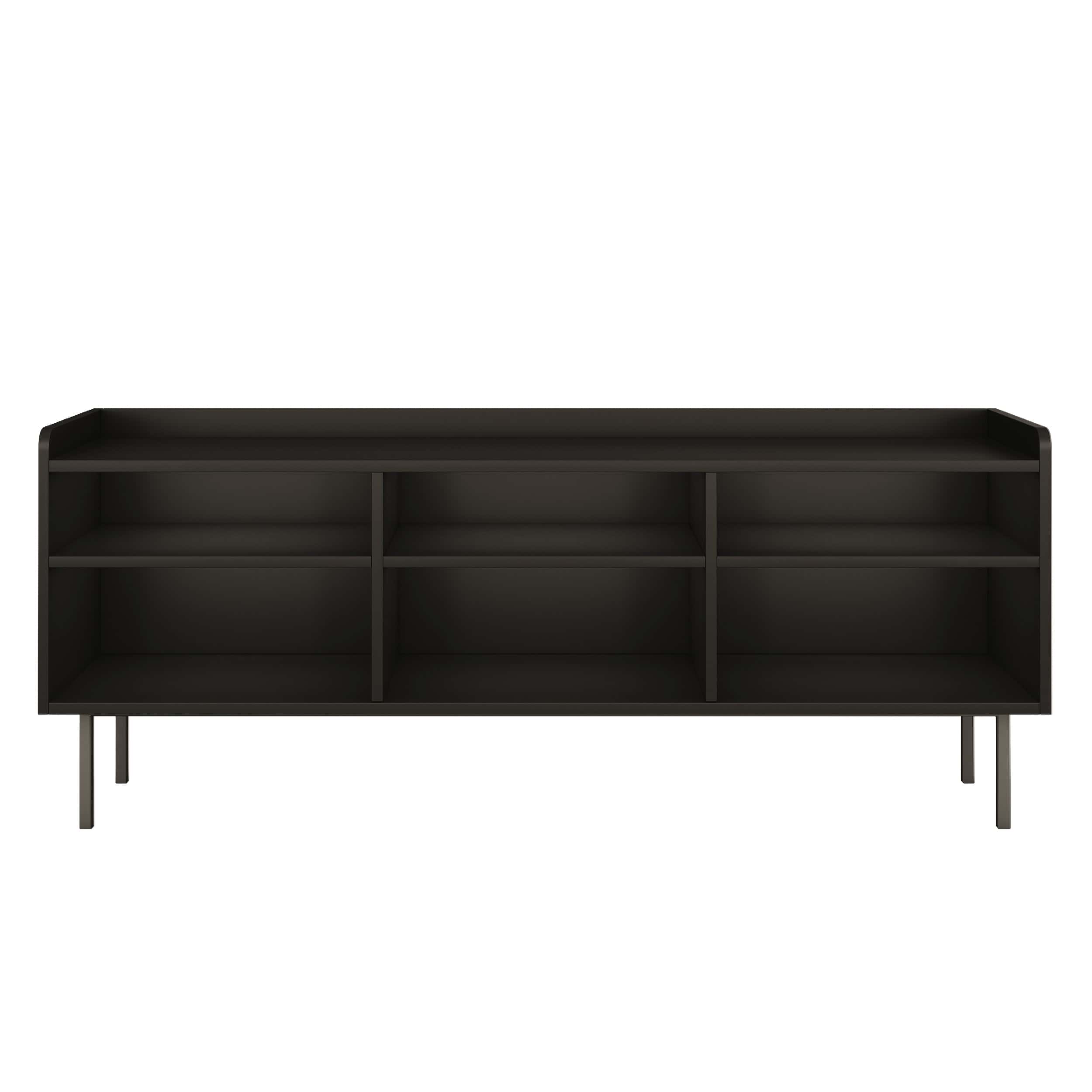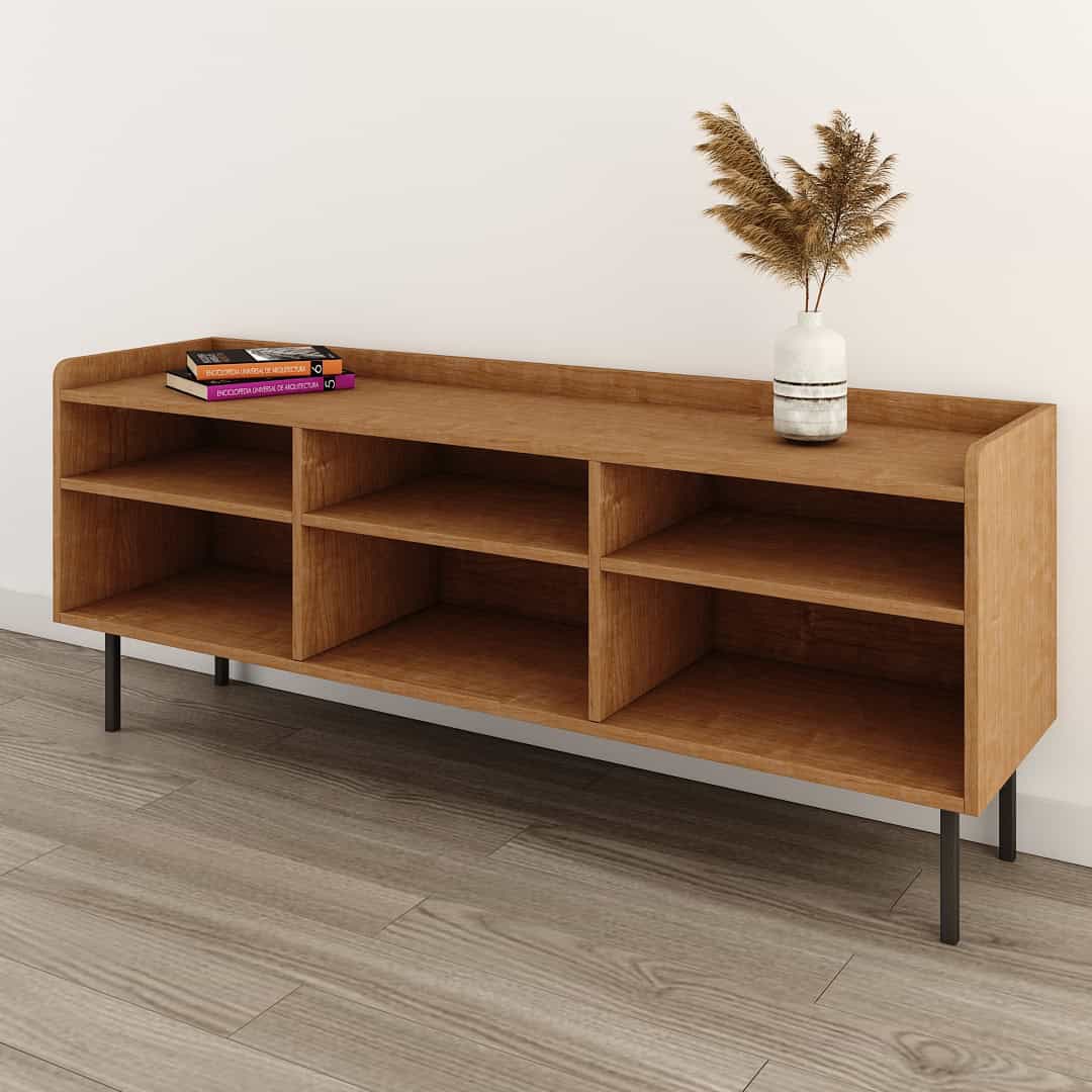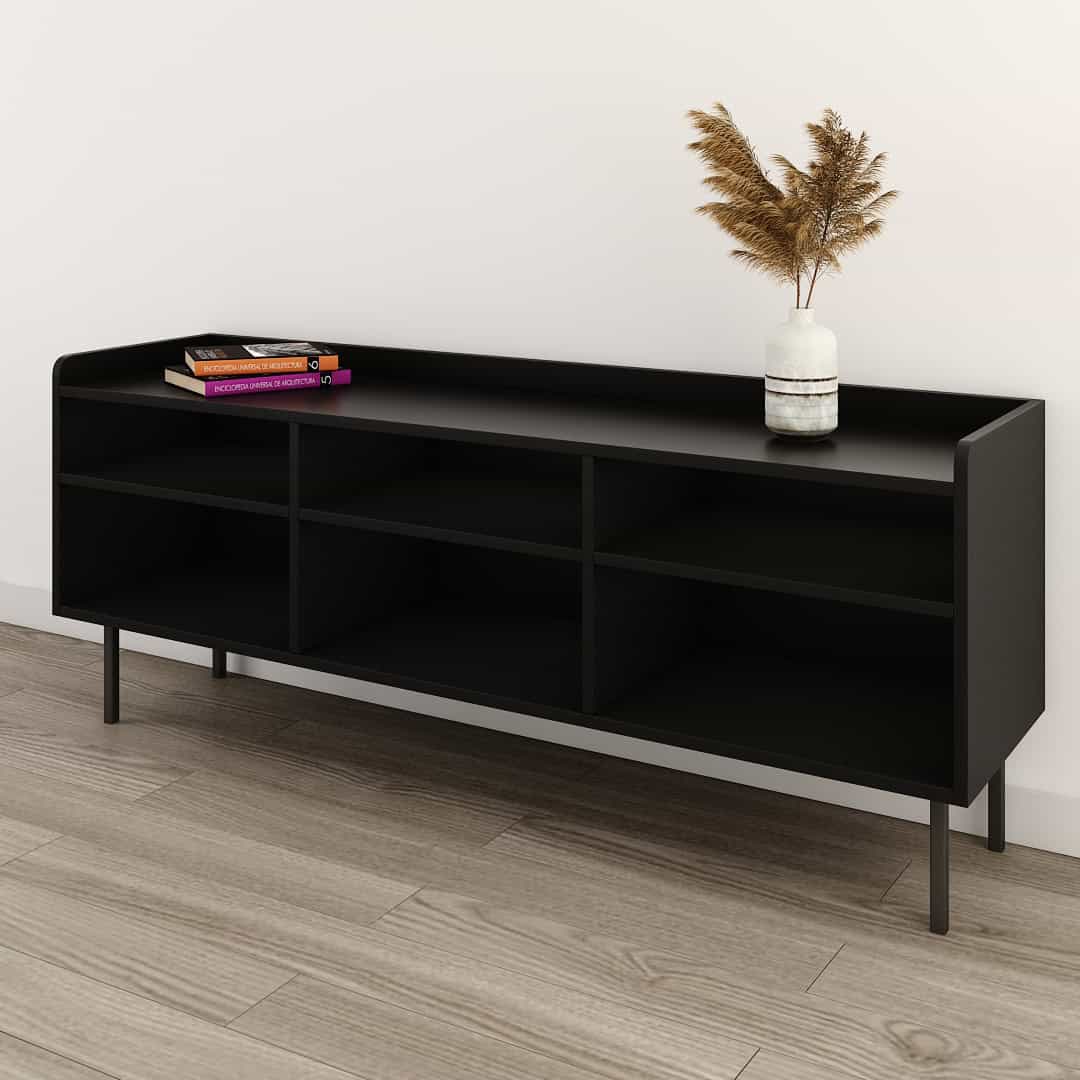 Su base metálica, en caño 20×20 mm pintada, eleva el cuerpo 20 cm del suelo, dando estabilidad y realzando su aspecto minimalista y contemporáneo. Los estantes abiertos permiten ventilación natural de dispositivos electrónicos y brindan múltiples opciones de uso.