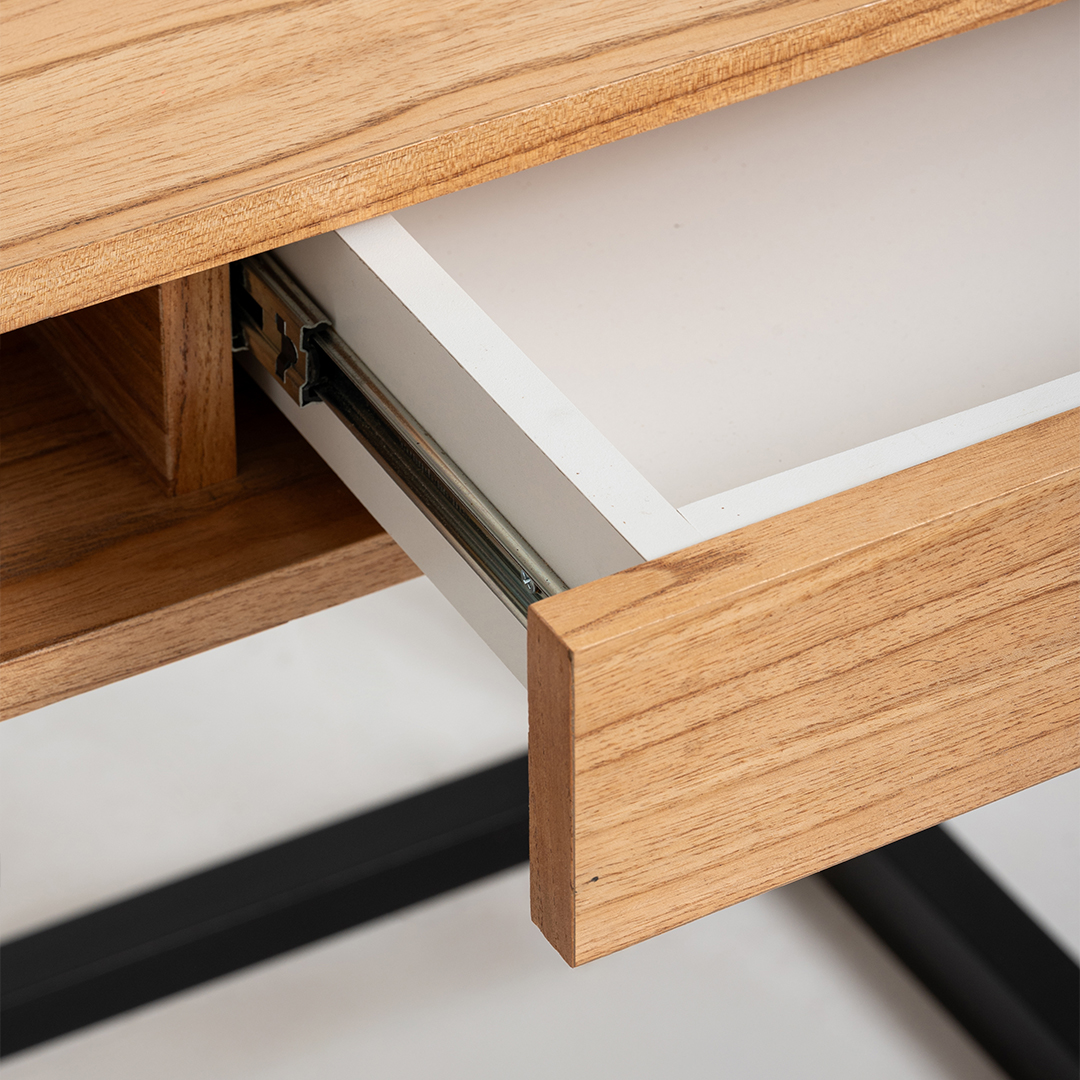 Su diseño ofrece un espacio abierto para guardar libros o dispositivos de uso diario, junto a un cajón, que aporta un detalle cálido y artesanal, ideal para mantener lo esencial organizado y a mano.