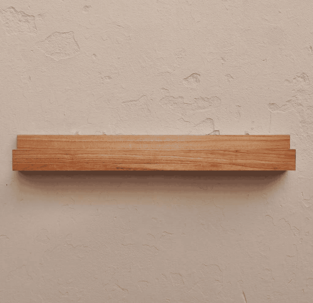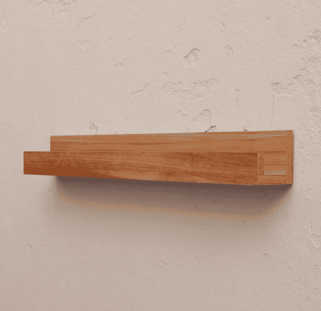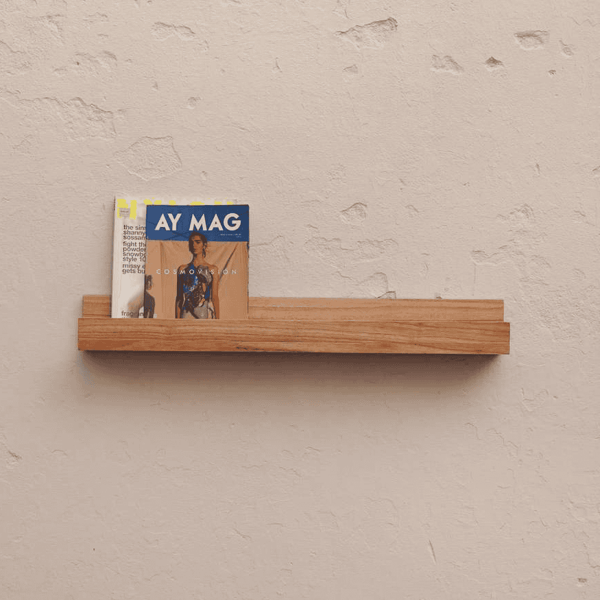 El Estante J de Los Palos combina líneas simples y una forma distintiva que le da su nombre: el perfil en “J” permite sujetar libros, marcos o pequeños objetos decorativos de manera más segura, evitando que se deslicen.