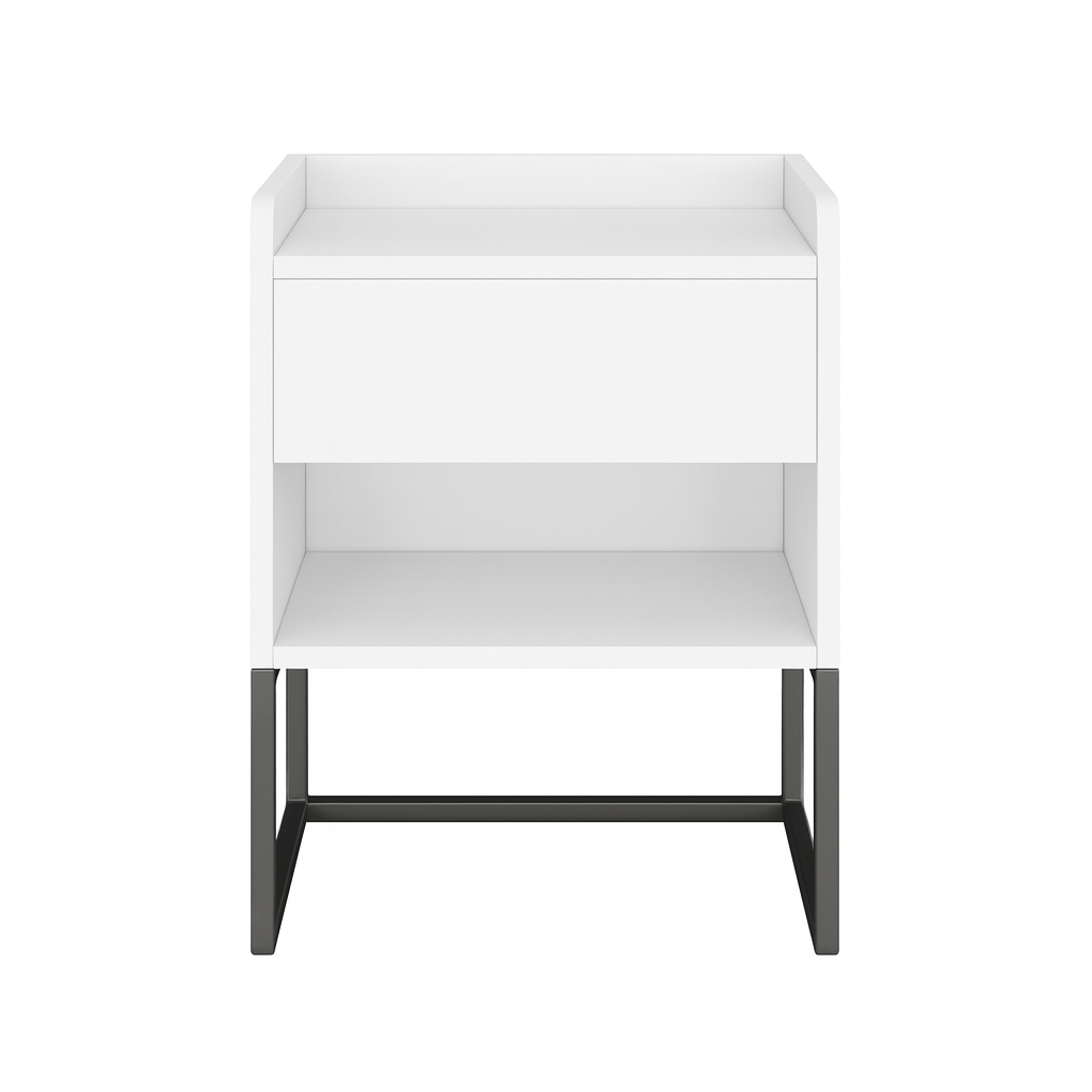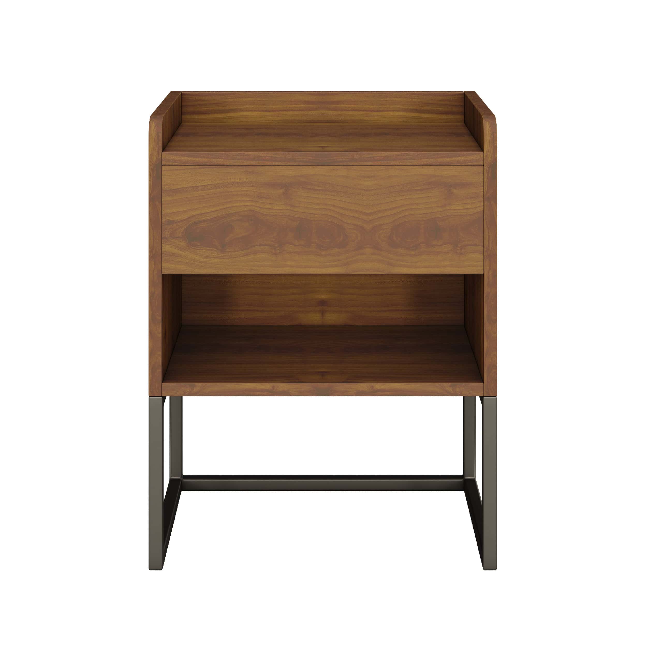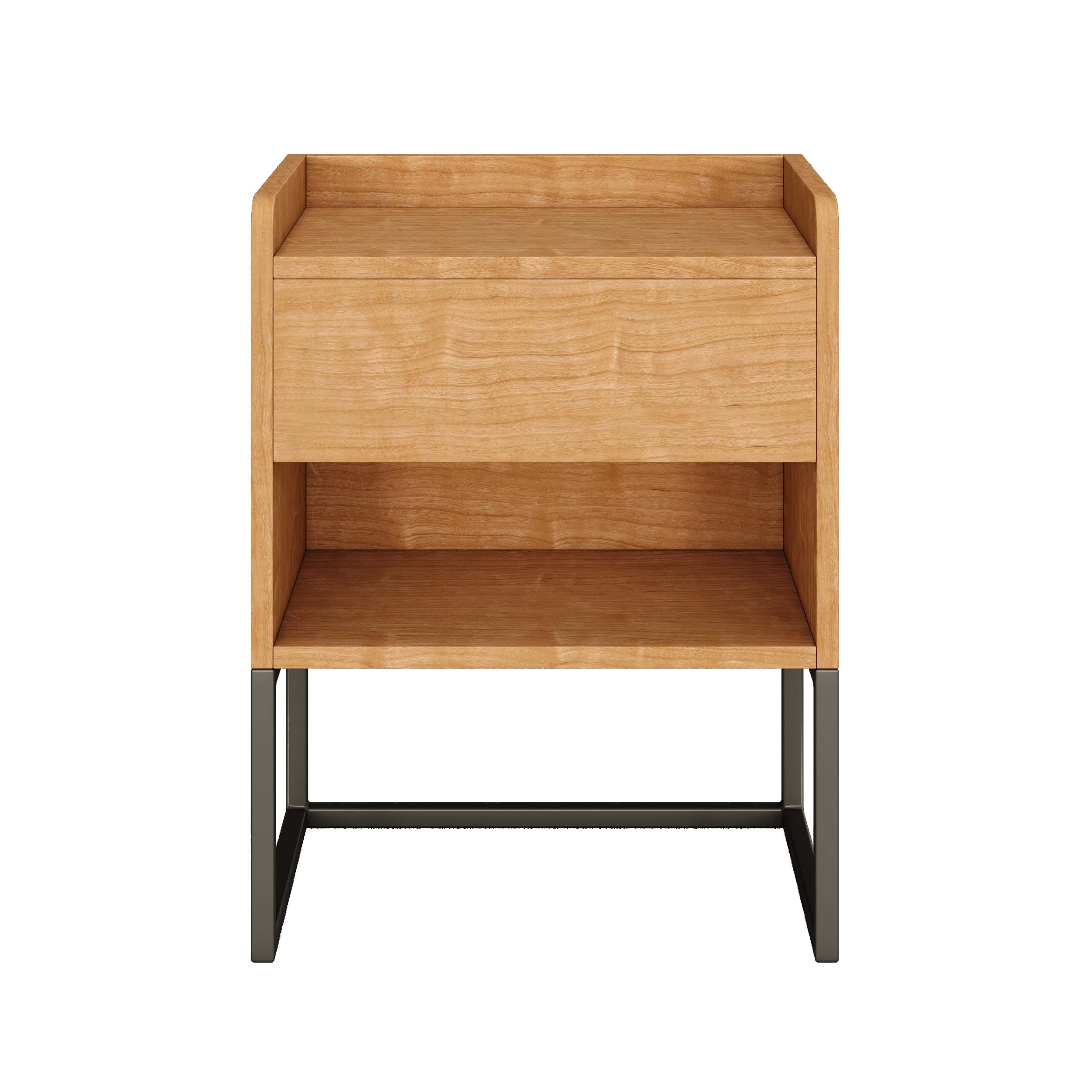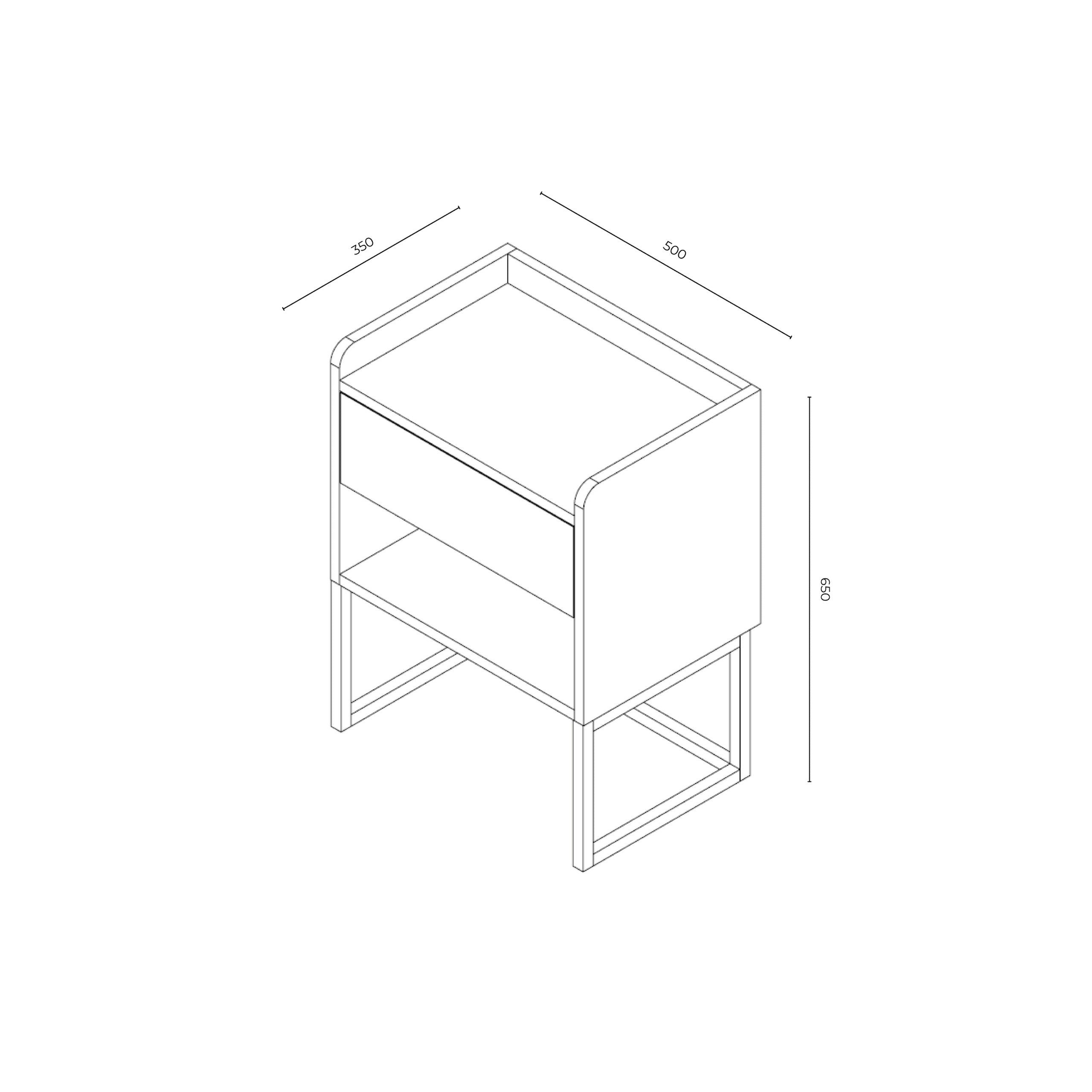 Incluye un cajón superior, con apertura desde la parte inferior, que permite un uso práctico y discreto, manteniendo el frente limpio. El cajón se complementa con correderas telescópicas de primera calidad para una apertura suave y duradera. Además, cuenta con un estante abierto inferior que brinda espacio accesible para libros, deco u objetos de uso diario.