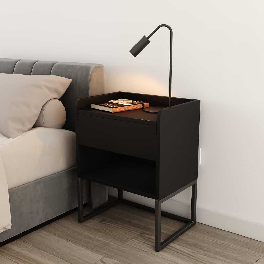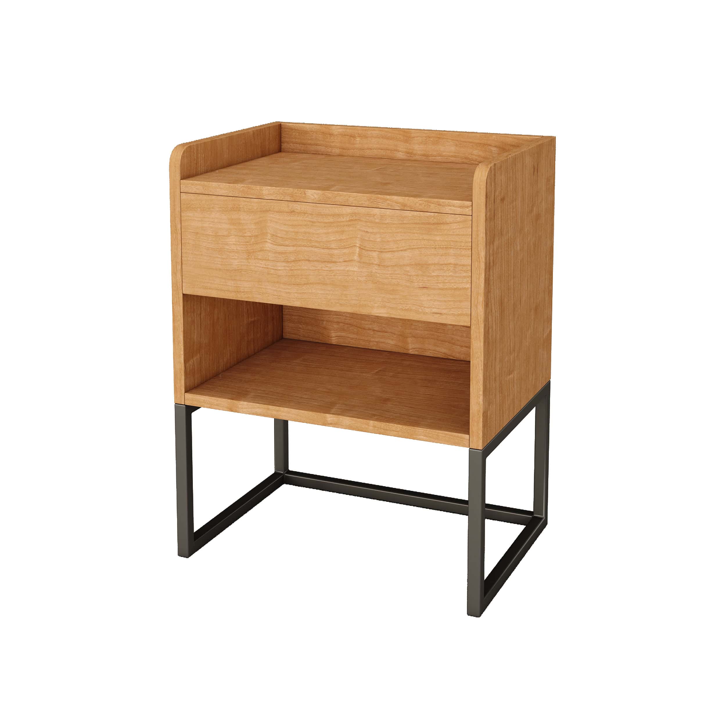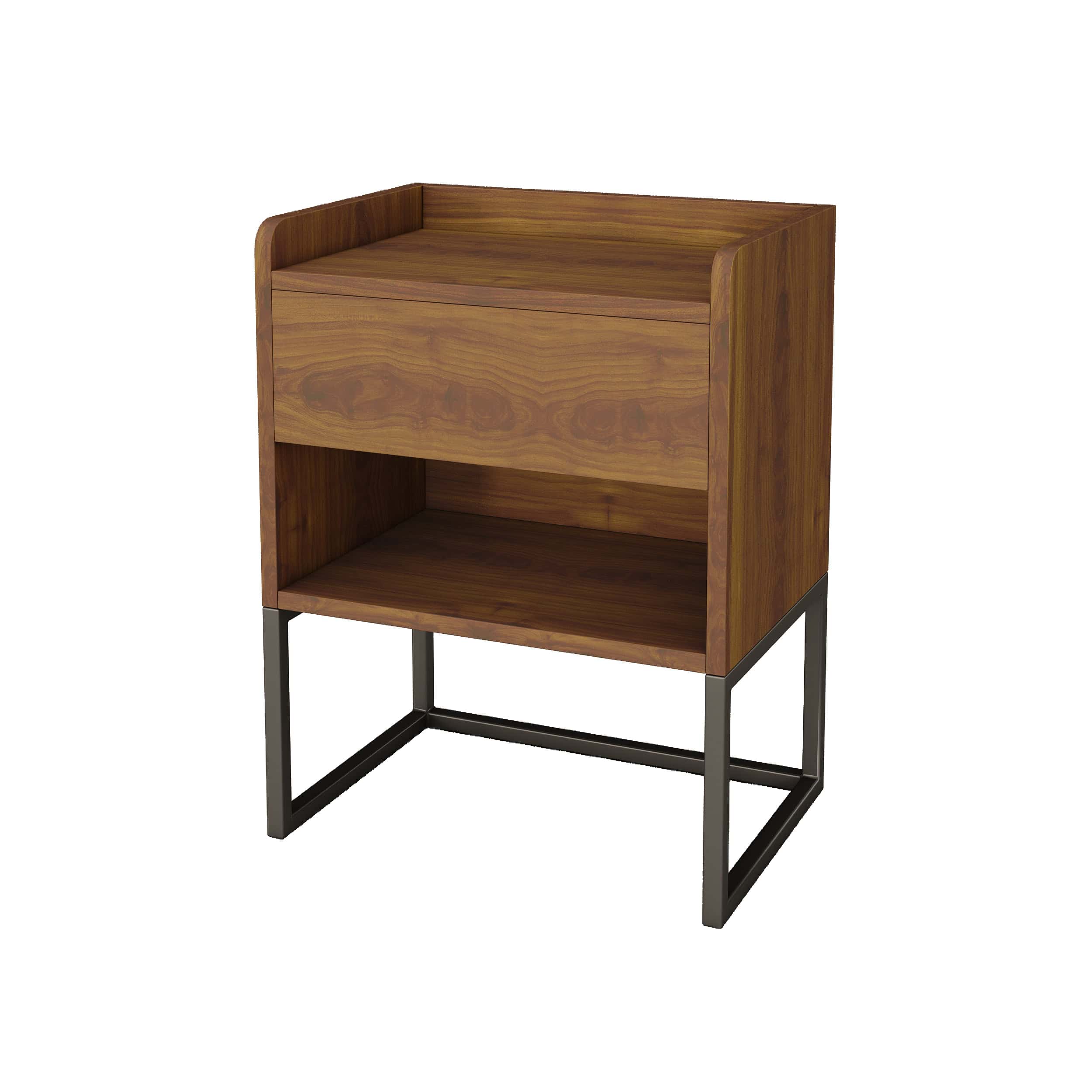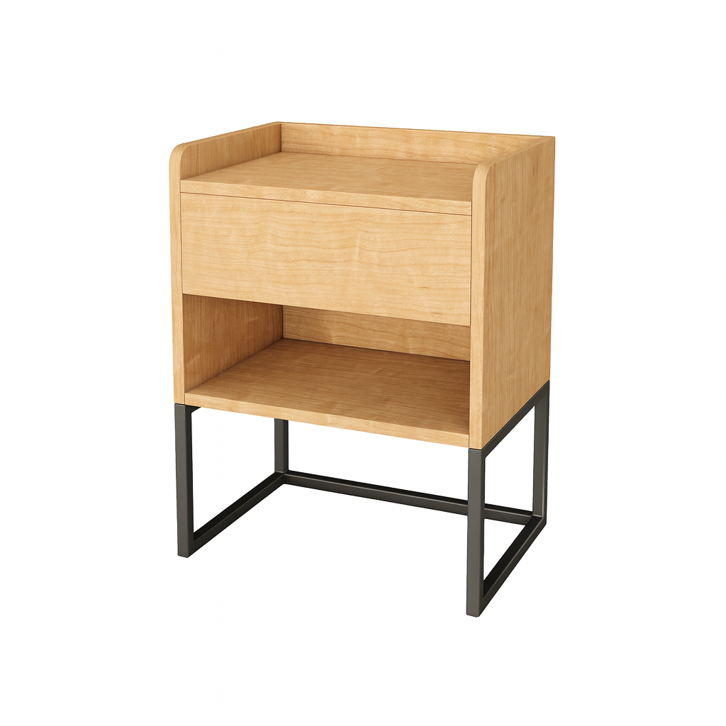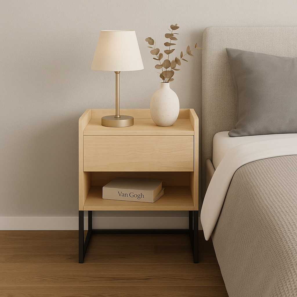 Incluye un cajón superior, con apertura desde la parte inferior, que permite un uso práctico y discreto, manteniendo el frente limpio. El cajón se complementa con correderas telescópicas de primera calidad para una apertura suave y duradera. Además, cuenta con un estante abierto inferior que brinda espacio accesible para libros, deco u objetos de uso diario.