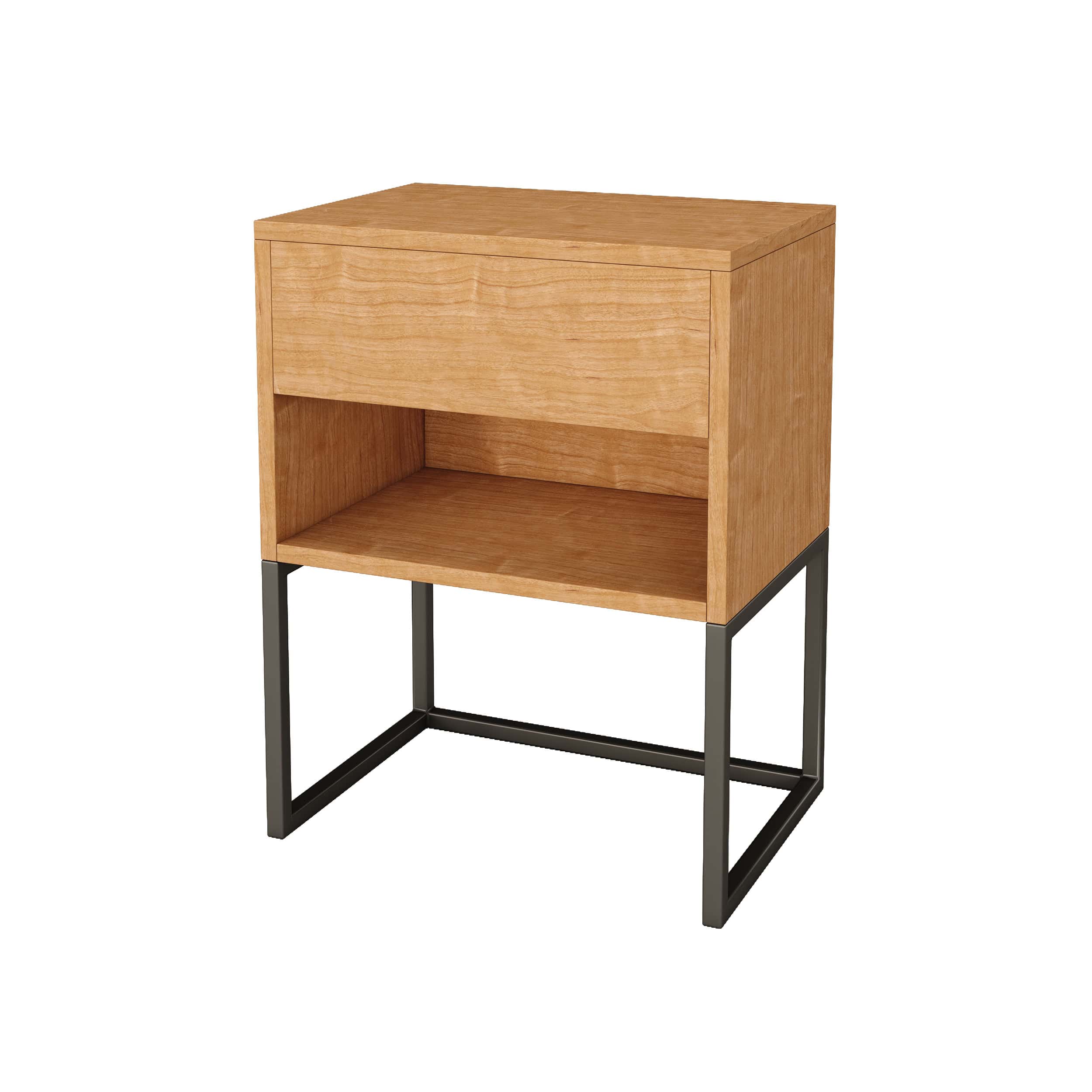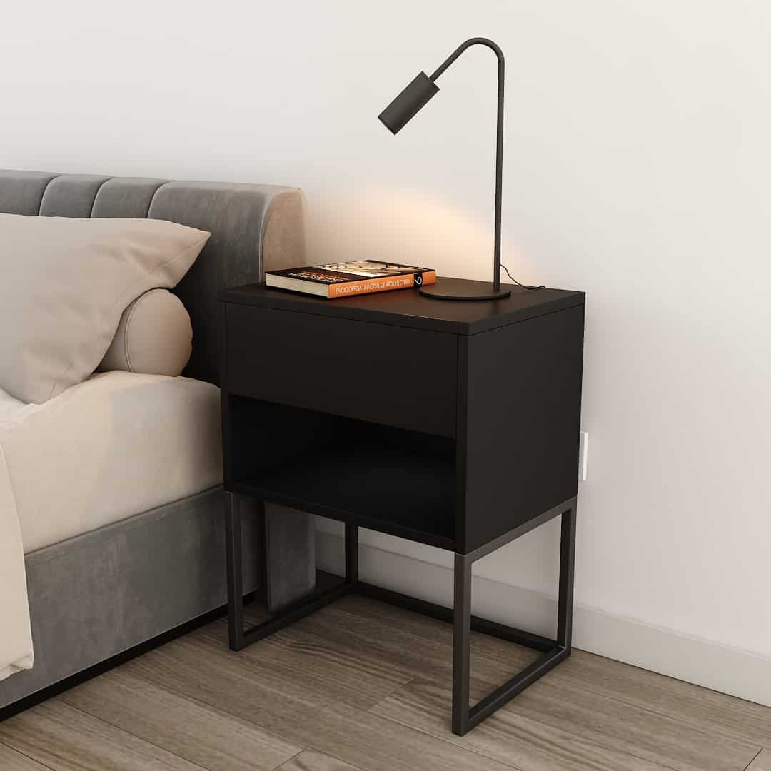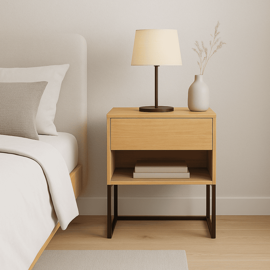 Incluye un cajón superior con correderas telescópicas de primera calidad, ideal para guardar objetos personales, y un estante abierto inferior que suma espacio accesible para libros, deco u objetos de uso diario.