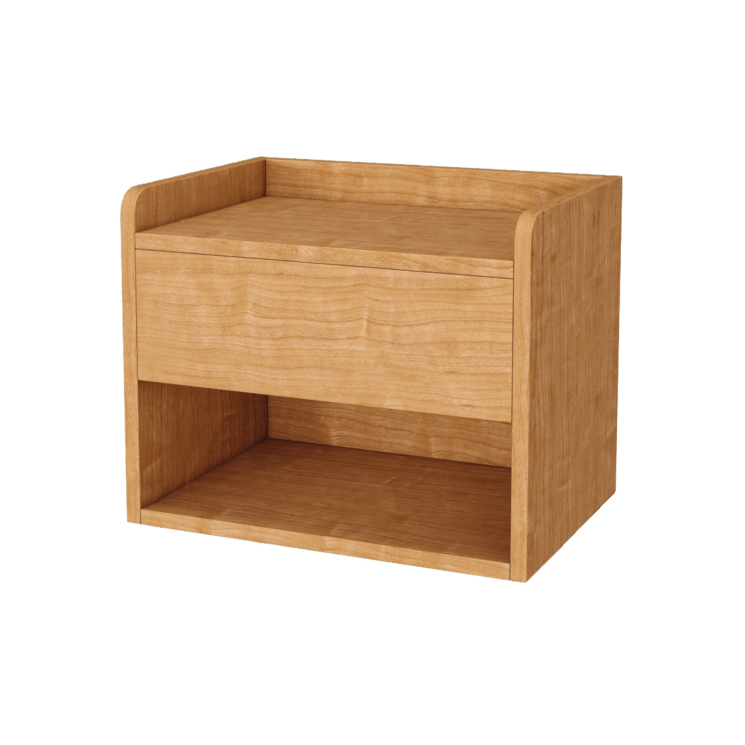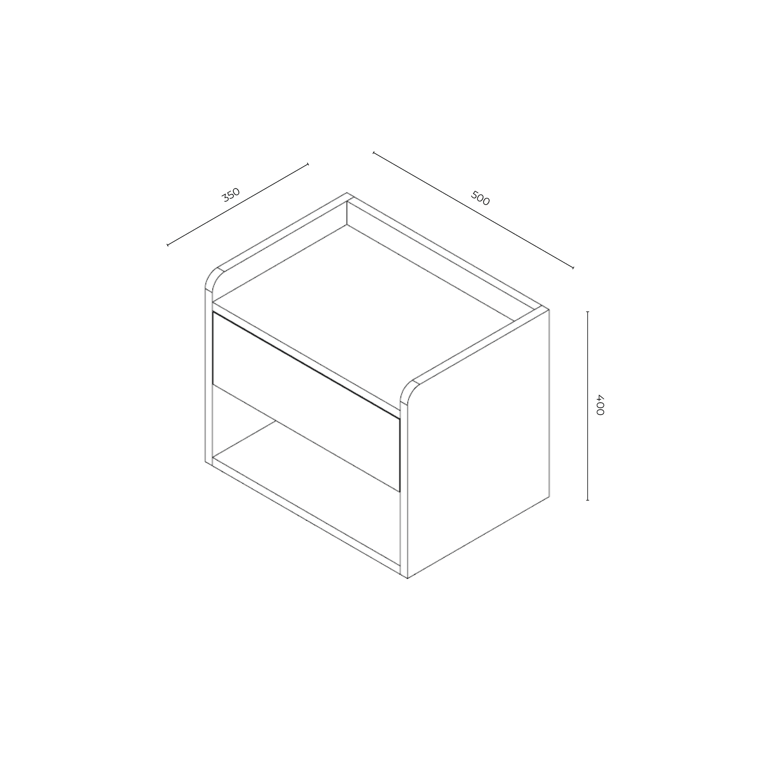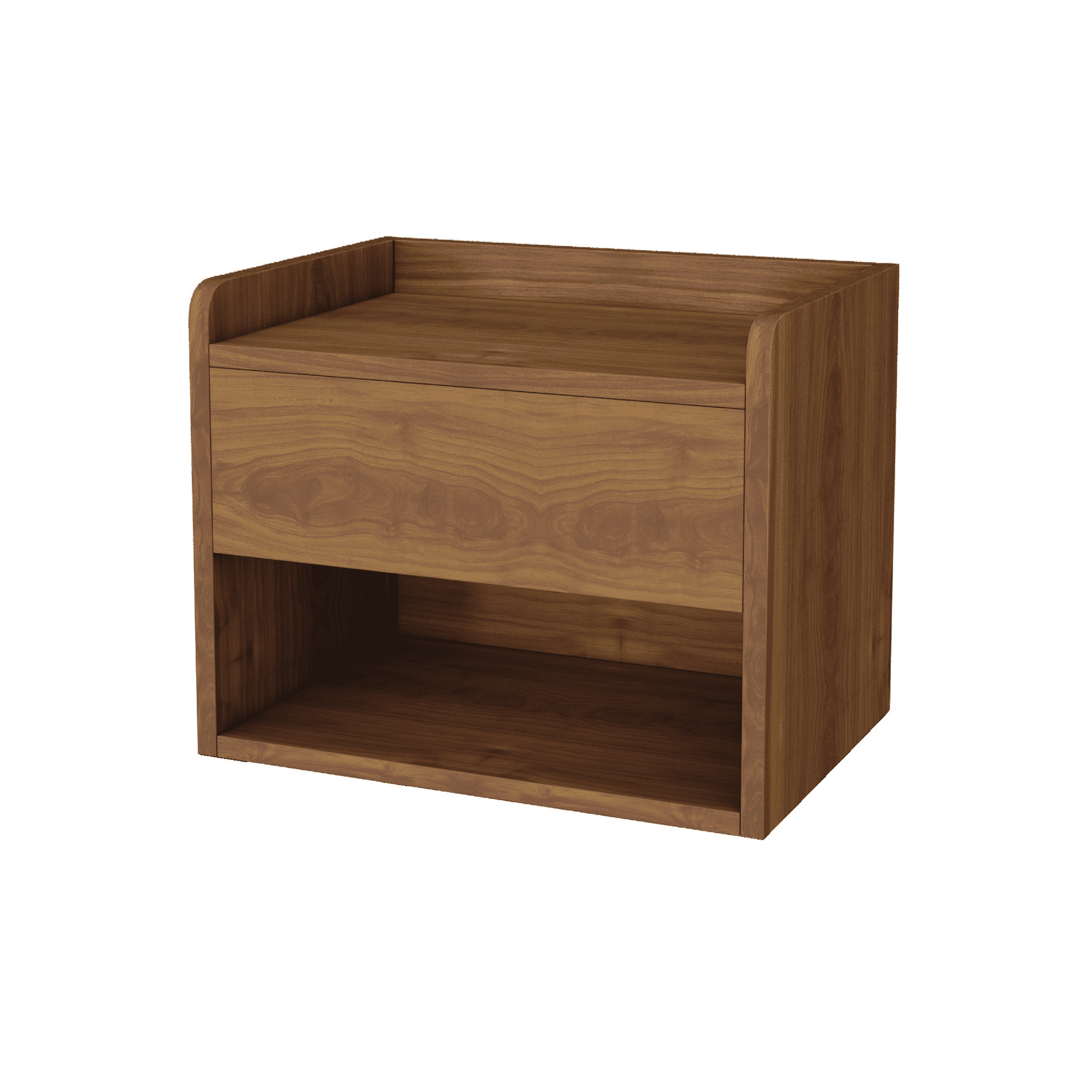 Incluye un cajón superior, con apertura desde la parte inferior, que permite un uso práctico y discreto, manteniendo el frente limpio. El cajón se complementa con correderas telescópicas de primera calidad para una apertura suave y duradera. Además, cuenta con un estante abierto inferior que brinda espacio accesible para libros, deco u objetos de uso diario.