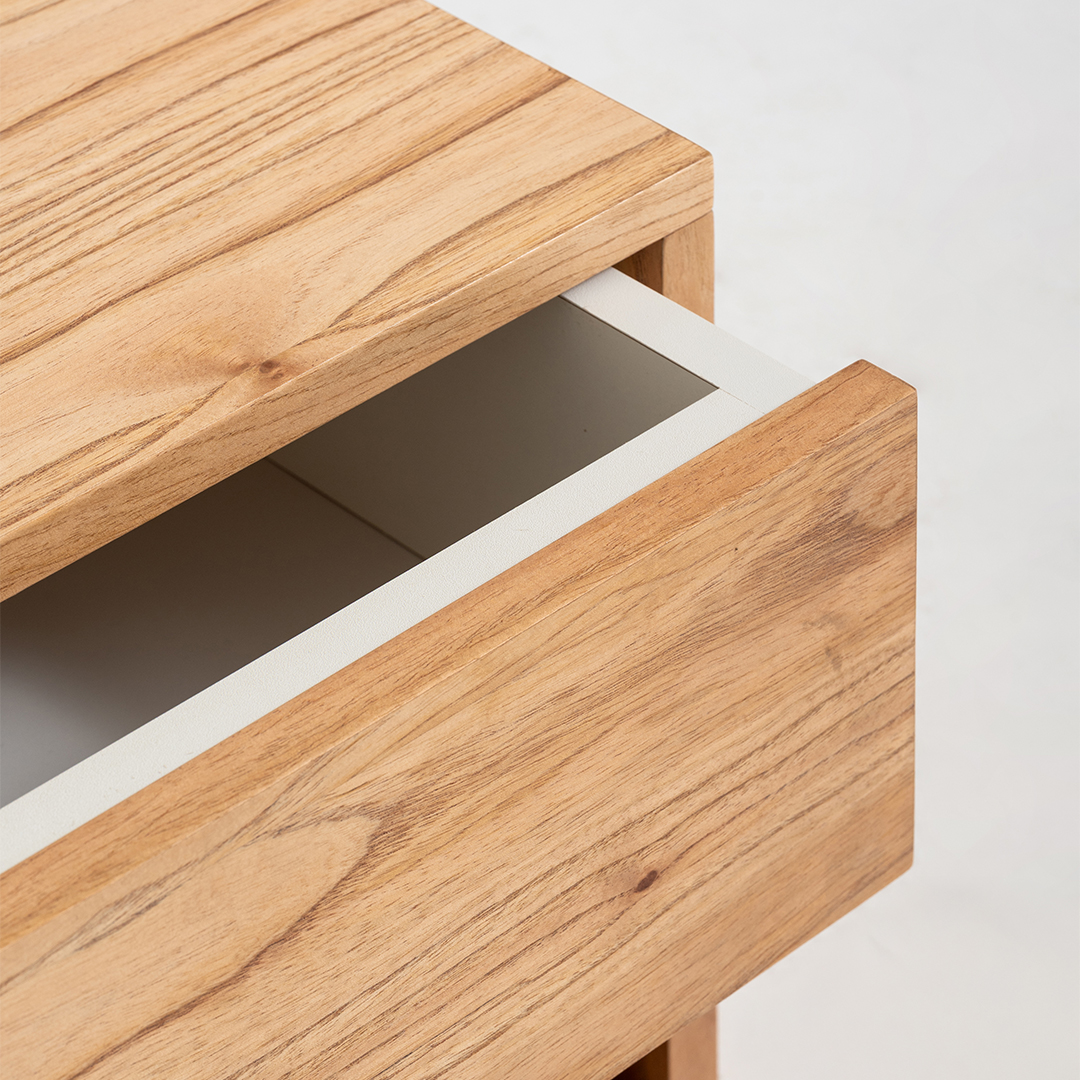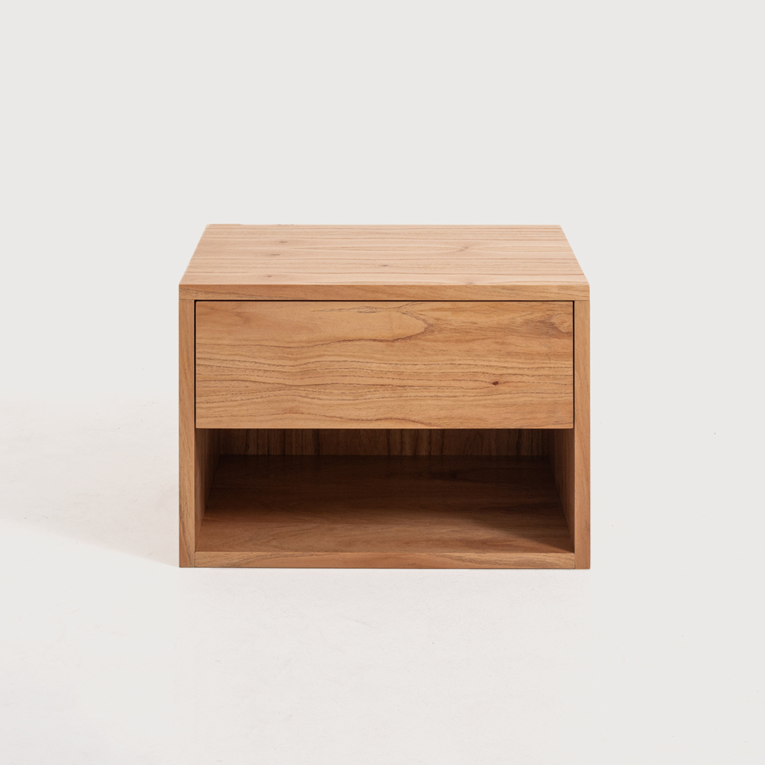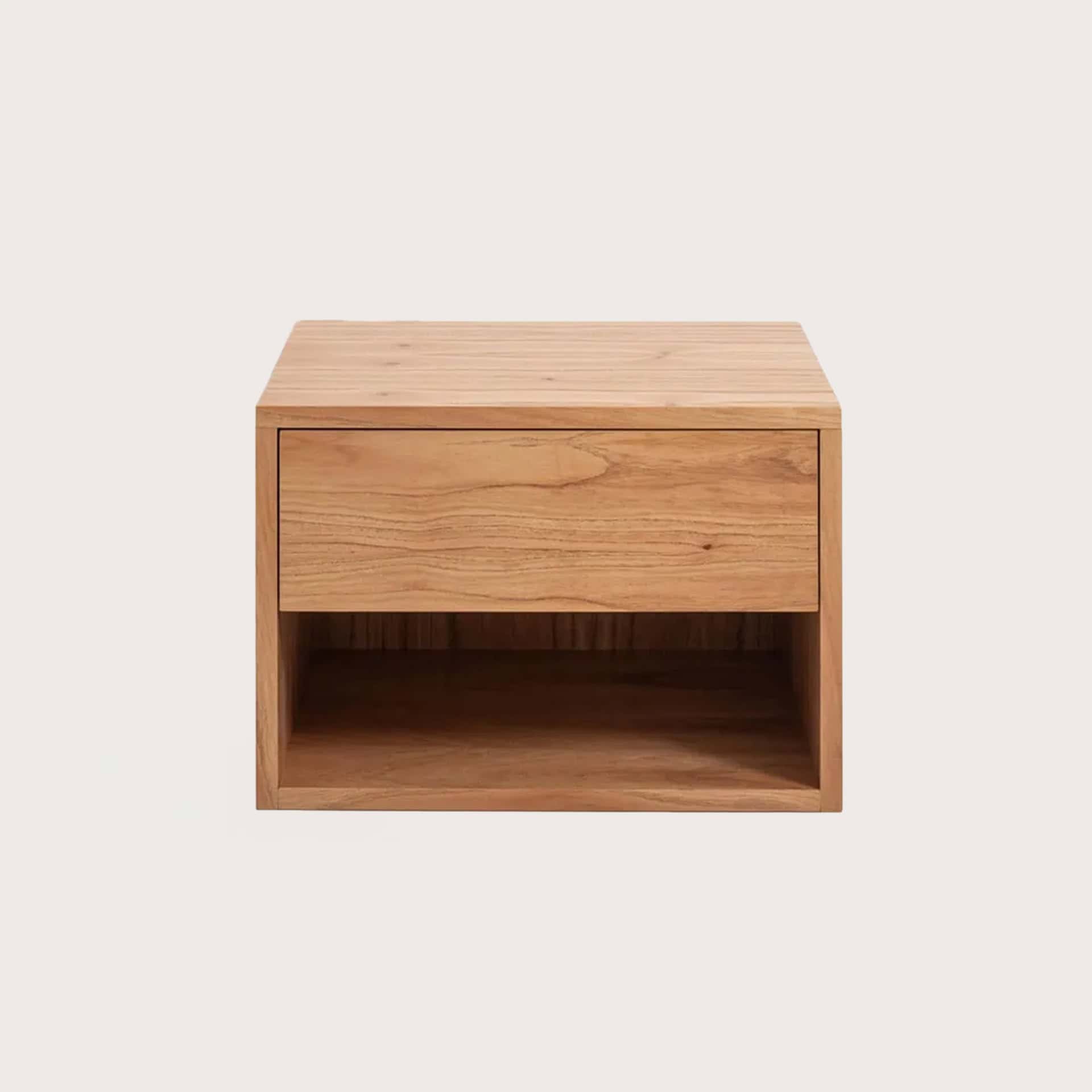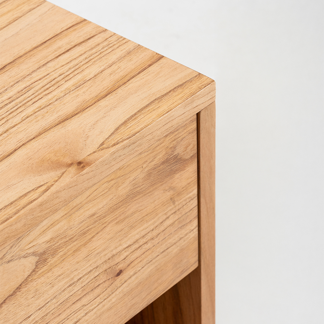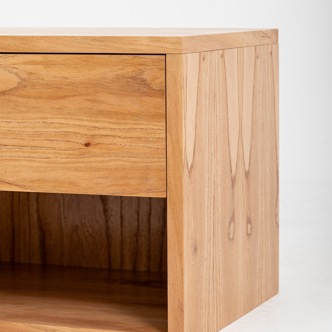 Incluye un cajón superior con correderas telescópicas de primera calidad, ideal para guardar objetos personales, y un estante abierto inferior que suma espacio accesible para libros, deco u objetos de uso diario.